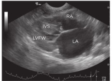 A 3 year old male Maine coon cat was presented for investigation of reduced appetite and his owner had also noticed changes in behaviour such as hiding in a cupboard for 2 days.Cardiac auscultation revealed tachycardia and a gallop sound but no obvious murmur or arrhythmia. Following partial improvement after treatment with frusemide and benazepril, the cat was referred for further investigation.The lateral thoracic radiograph from this case illustrates cardiomegaly with enlarged lobar vessels and an interstitial pattern suggestive of cardiogenic pulmonary oedema. The thorax also appears over-inflated probably due to dyspnoea.The echocardiography image (top right) shows concentric hypertrophy of the left ventricle and marked left atrial enlargement. Subjectively there also appears to be mild concentric hypertrophy of the right ventricle.